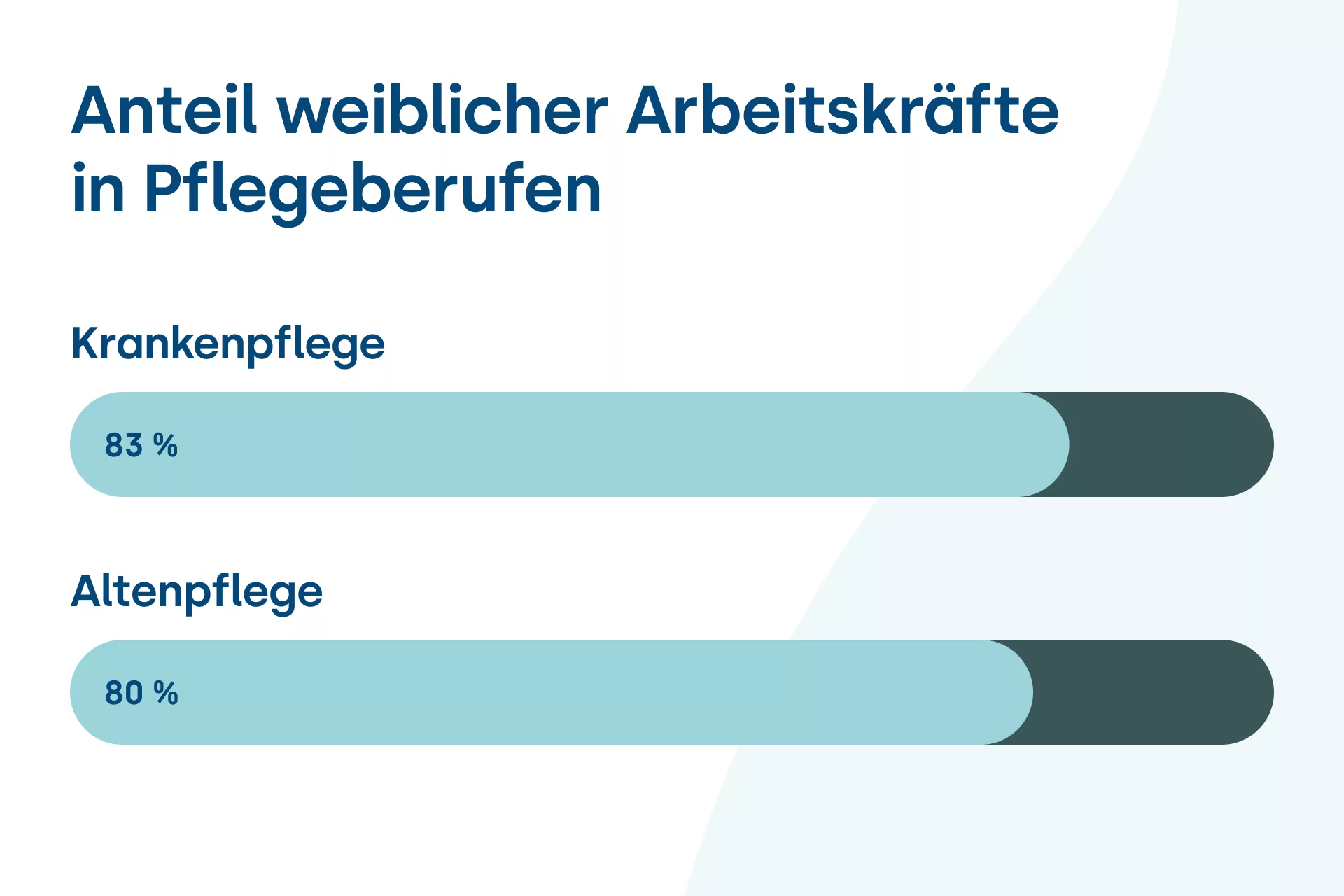 Auch im 21. Jahrhundert gilt die sogenannte Care-Arbeit, darunter Pflegeberufe, Pädagogik und soziale Arbeit, aufgrund alter gesellschaftlicher Strukturen nach wie vor als weiblich. In Deutschland wird der Pflegeberuf überwiegend von weiblichen Arbeitskräften dominiert. In der Krankenpflege sind etwa 83 Prozent der Pflegekräfte weiblich, in der Altenpflege 80 Prozent.